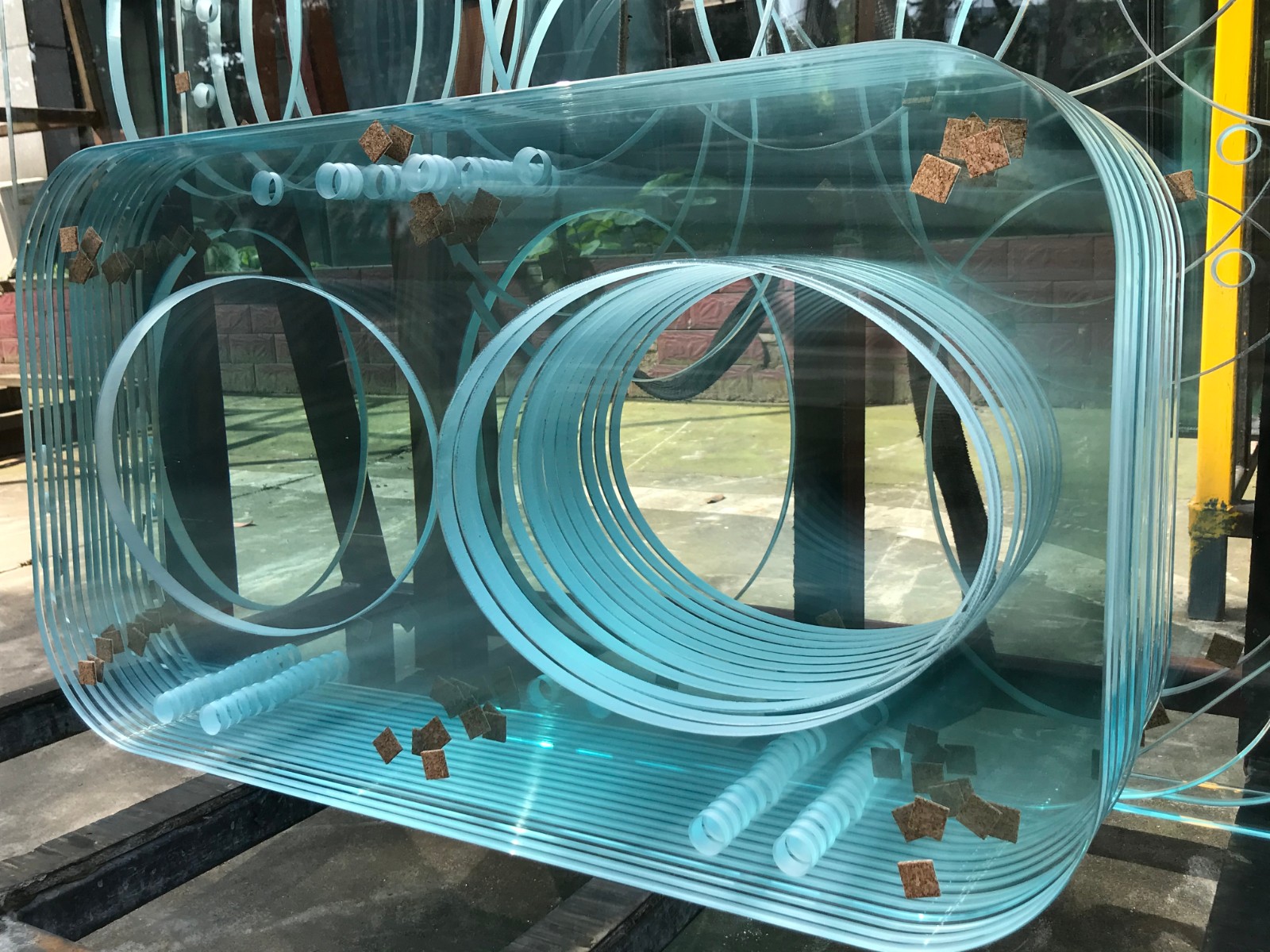 二、長沙工藝玻璃采用熱熔法進行加工。玻璃熱熔模具用砂模貨硅酸鋁纖維紙與板。常用的為砂模,將純凈的石英在爐膛內鋪平,砂層厚約1.5cm,然后按設計的圖按用竹桿作畫,細節部分可用木筷描繪,于是就在石英砂上形成凹形的圖案作為陰模,再在上面撒上脫模粉,然后將平板玻璃平放在石英砂紙成的陰模上,當玻璃加熱到軟化點以上,即因自重沉到砂模中成形。